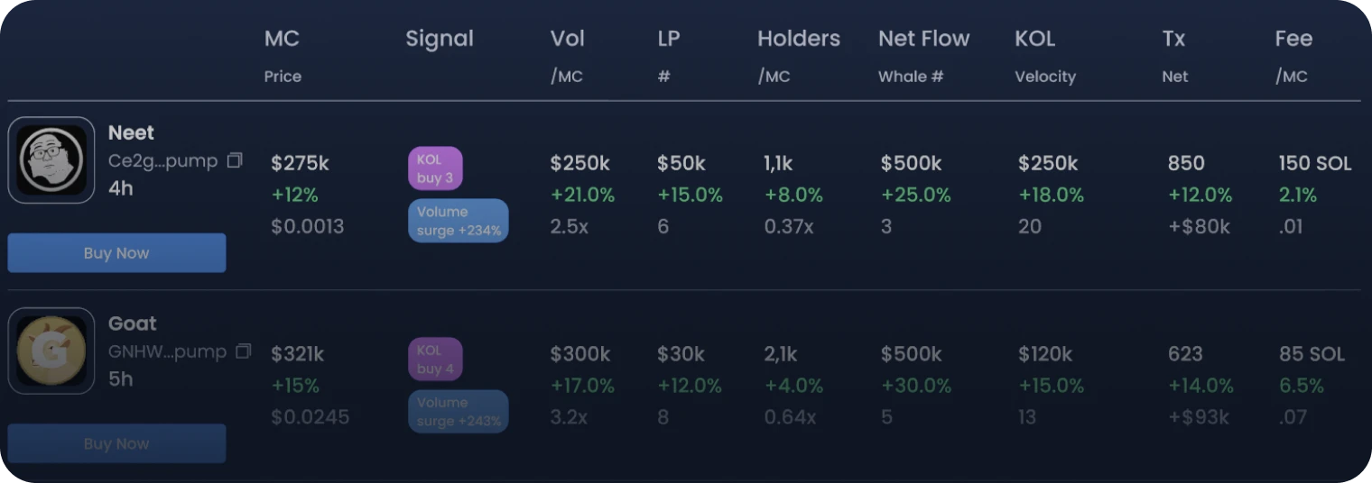 Volume, LP, holders, net flow — all upfront, sortable, and clean.